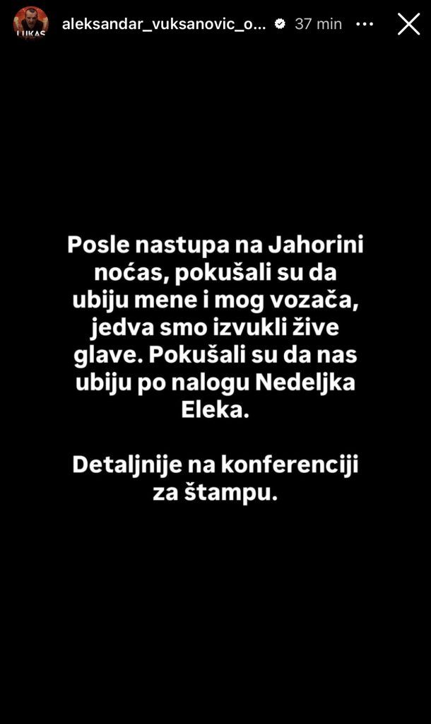 – Poslije nastupa na Jahorini noćas, pokušali su da ubiju mene i mog vozača. Jedva smo izvukli žive glave. Pokušali su da nas ubiju po nalogu Nedeljka Eleka – napisao je Lukas u objavi koja se velikom brzinom proširila društvenim mrežama.