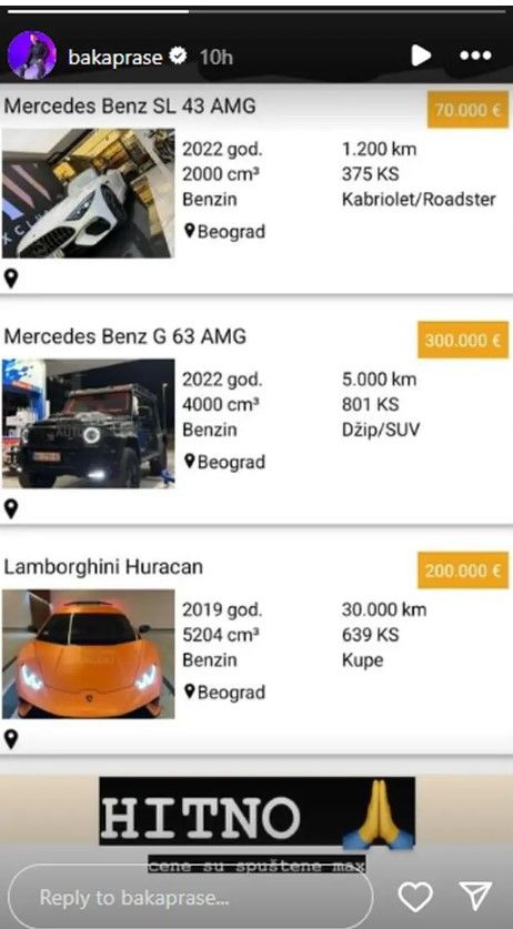 Zatim je podijelio snimak zaslona gdje je pokazao da prodaje svoje luksuzne automobile. Jutjuber za njih traži ukupno 570.000 eura i kaže da je ”hitno” te da je ”maksimalno spustio cijene”.