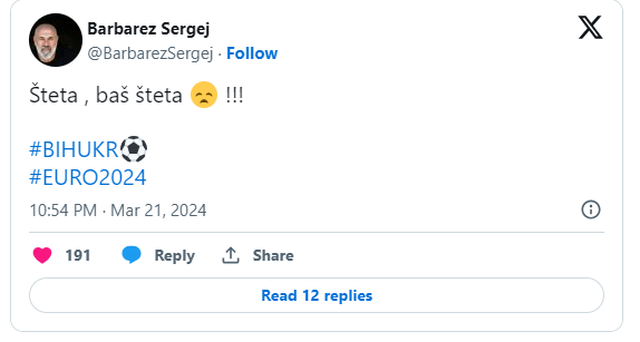 Legenda fudbalske reprezentacije Bosne i Hercegovine Sergej Barbarez oglasio se nakon sinoćnjeg poraza Zmajeva od Ukrajine (1:2).
