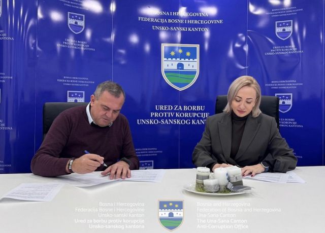 BIHAĆ, 24. novembar – Sekretar Ureda za borbu protiv korupcije Unsko-sanskog kantona Adela Tabaković i direktor Kantonalnog zavoda za pružanje besplatne pravne pomoći Andrej Mamontov danas su potpisali Sporazum o saradnji u pružanju stručne pomoći prijaviteljima korupcije u pokretanju sudskog postupka i zastupanja pred nadležnim sudom.
