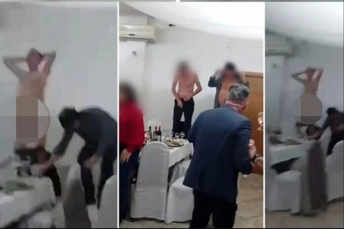 Na videu se vidi gost koji se penje na sto, spušta hlače i pleše go dok ga dio okupljenih bodri smijehom i povicima, prenosi Index.hr.