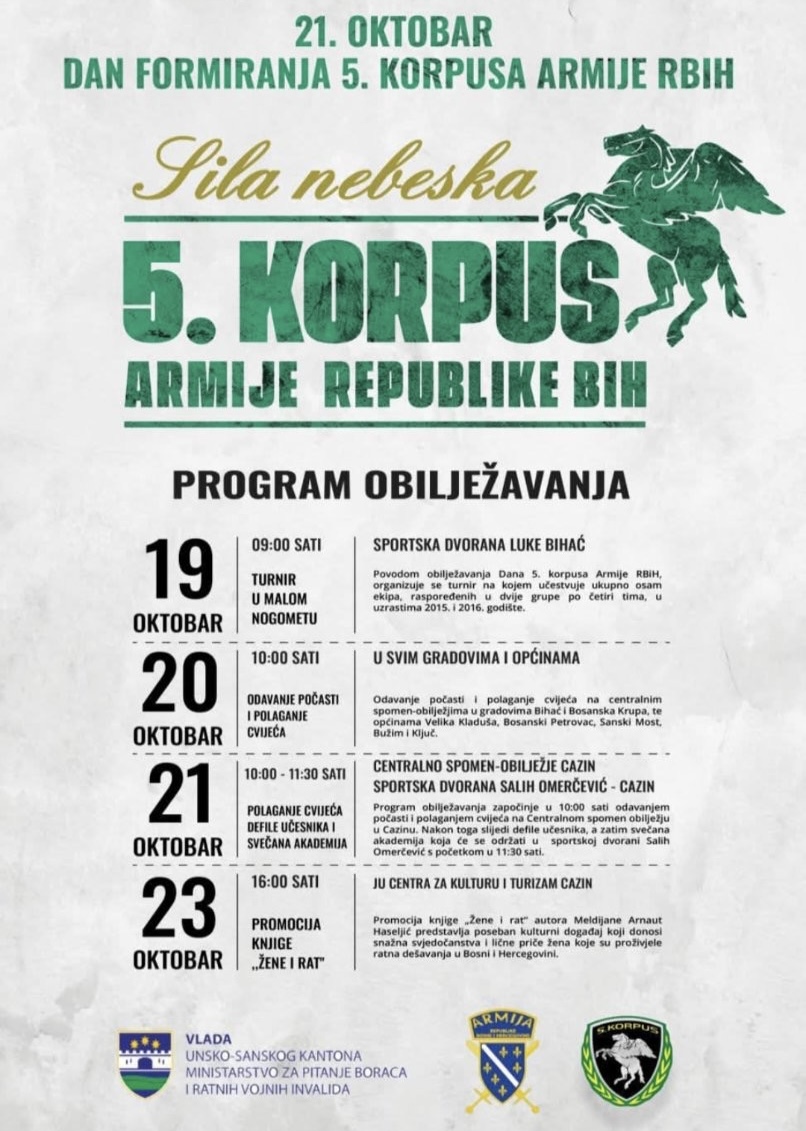 U povodu 21. oktobra – Dana formiranja 5. korpusa Armije Republike BiH, jednog od najznačajnijih datuma u novijoj historiji Bosne i Hercegovine, na području Unsko-sanskog kantona održava se niz prigodnih aktivnosti.