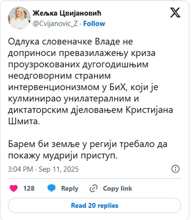 U poruci na društvenoj mreži X, Cvijanović je kratko komentarisala ovu odluku slovenske vlade.