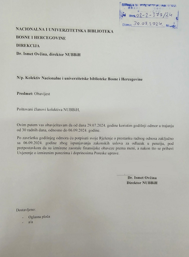 “Kolektiv Nacionalne i univerzitetske biblioteke BiH je od Ovčine tražio da se pismeno obaveže kako će po završetku korištenja godišnjeg odmora potpisati svoje Rješenje o penzionisanju. Imenovani je nastavio odgađati odlazak u penziju potpisavši neku vrstu obavijesti i uslovljavajući penzionisanje izmirivanjem zaostalih finansijskih obaveza prema njemu i pribavljanjem Uvjerenja o izmirenim porezima i doprinosima Poreske uprave (što je nemoguće dok se ne dostavi Rješenje o prestanku radnog odnosa zbog odlaska u penziju).