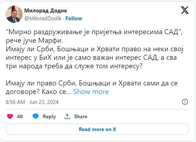 – “Mirno razdruživanje je prijetnja interesima SAD”, reče jučer Marfi. Imaju li Srbi, Bošnjaci i Hrvati pravo na neki svoj interes u BiH ili je samo važan interes SAD, a sva tri naroda treba da služe tom interesu? Imaju li pravo Srbi, Bošnjaci i Hrvati sami da se dogovore? Kako se dogovorimo, tako će nama biti. Ili treba da budemo pokusni kunići u nečijem eksperimentu.