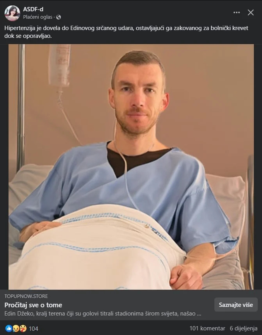 Na društvenim mrežama se pojavio oglas u kojem se navodi da je Edin Džeko imao srčani udar i da se izliječio uz pomoć proizvoda koji se tom prilikom reklamira.