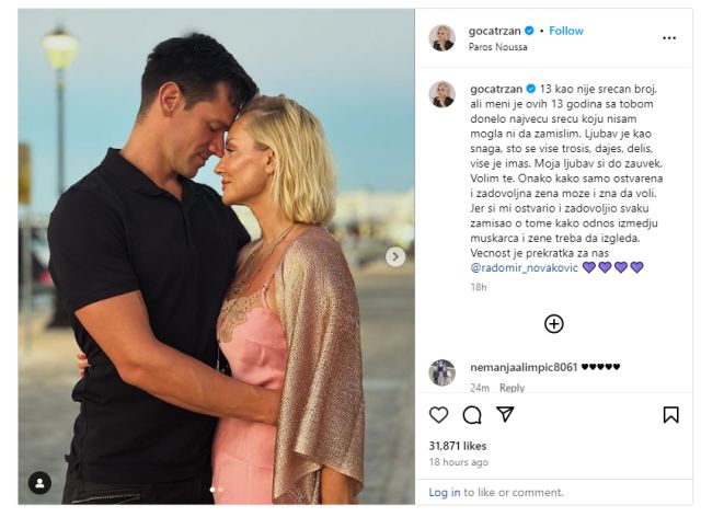 – Meni je ovih 13 godina sa tobom donijelo najveću sreću koju nisam mogla ni da zamislim. Ljubav je kao snaga, što se više trošiš, daješ, dijeliš, više je imaš. Moja ljubav si do zauvijek. Volim te. Onako kako samo ostvarena i zadovoljna žena može i zna da voli. Jer si mi ostvario i zadovoljio svaku zamisao o tome kako odnos između muškarca i žene treba da izgleda. Vječnost je prekratka za nas – napisala je Goca Tržan ispod zajedničke slike s mužem.