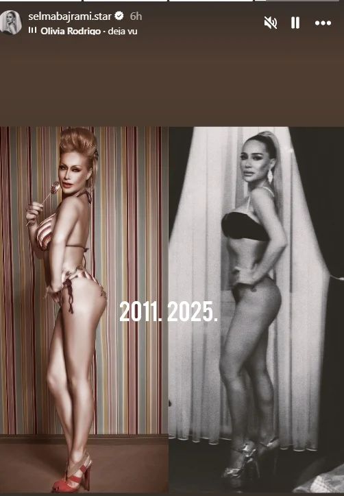 Naime, pjevačica je na svom Instagram Storyju objavila dvije fotografije – jednu iz 2011. godine, na kojoj pozira u kupaćem kostimu ispred šarenih zidnih tapeta i drugu crno-bijelu fotografiju iz 2025. godine, gdje je pozirala u sličnoj pozi. Pjevačica je objavom istakla kako i danas zadržava savršenu figuru, potvrđujući da su godine samo broj.