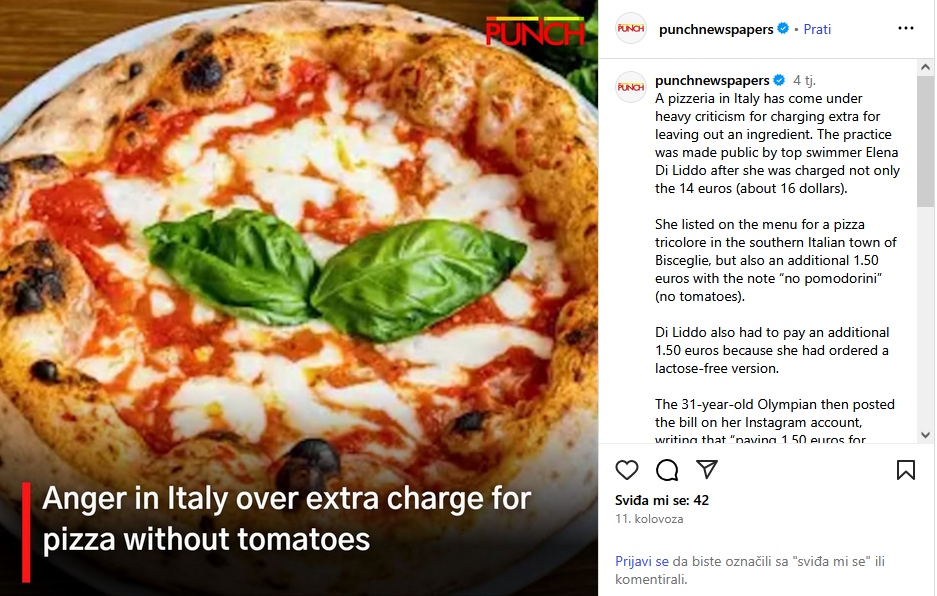 Primjer su ovih dana prenijeli brojni italijanski listovi. Picerija koja je naplatila dodatno nadomještanje u početku nije željela komentarisati događaj.