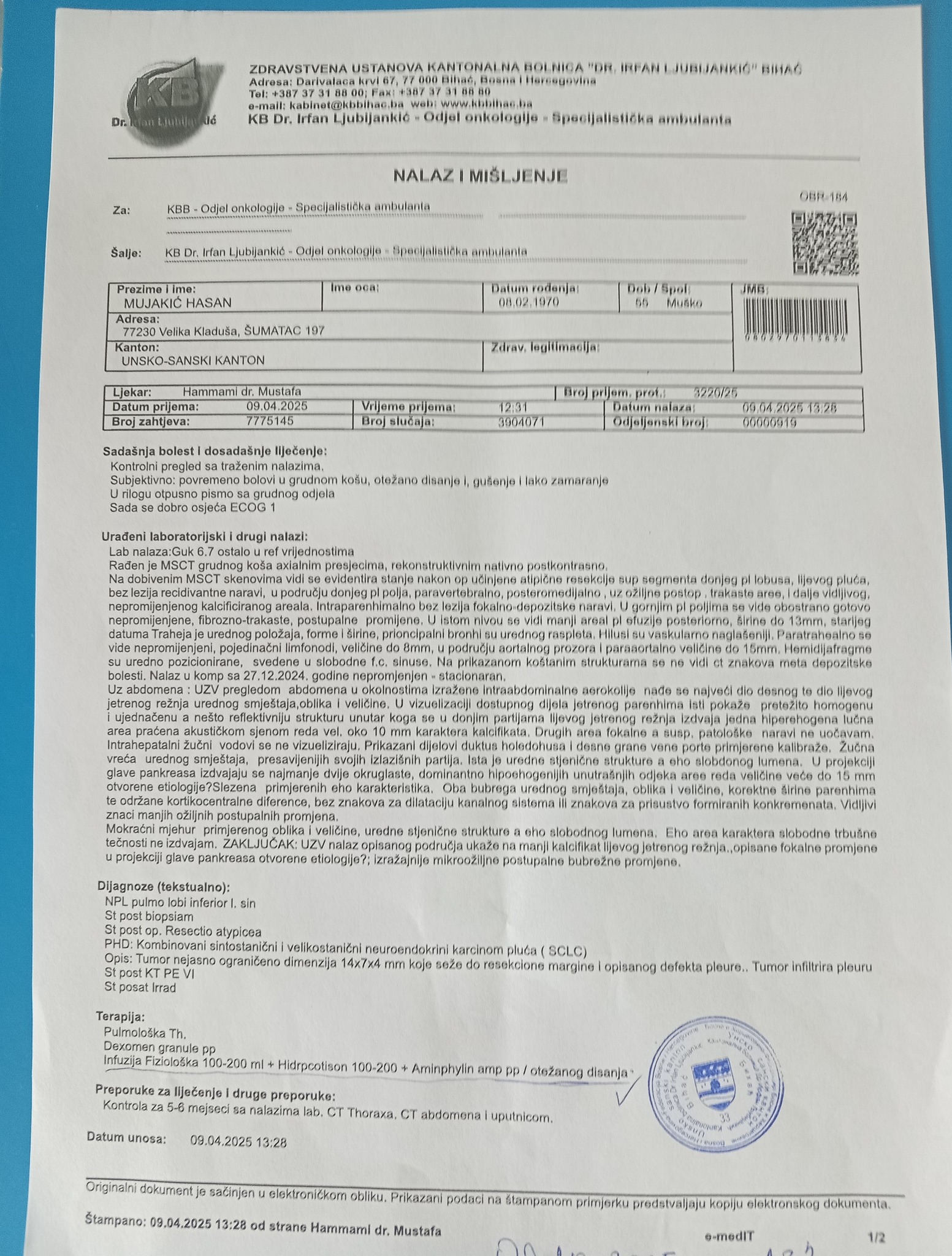 Hasan Mujakić iz Velike Kladuše već dvije godine vodi tešku životnu bitku s dijagnozom zloćudnog neuroendokrinog karcinoma pluća (SCLC/LNEC). Tokom tog perioda prošao je kroz operaciju, brojne terapije, infuzije i injekcije, a trenutno se nalazi na kućnom liječenju, gdje svakodnevno koristi kisik zbog otežanog disanja i trajnog oštećenja pluća – funkcionalnost mu je smanjena na svega 35%.
