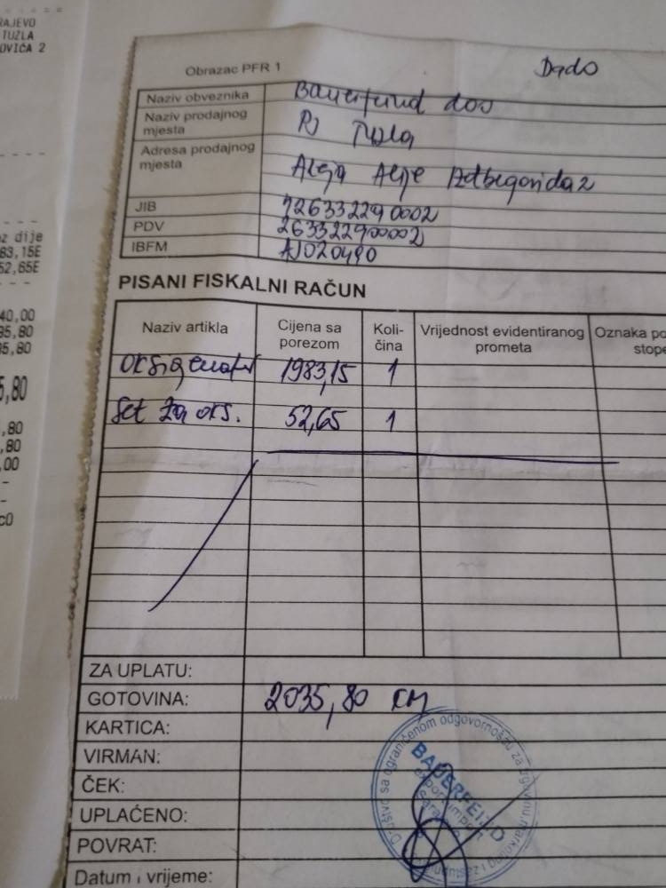 Na preporuku pulmologa i onkologa iz Bihaća i Tuzle, Hasan se odlučio da pokuša nabaviti medicinski koncentrator kisika, uređaj koji putem električne energije proizvodi kisik i u potpunosti zamjenjuje boce. Aparat je dostupan odmah, pod garancijom, a ukupna cijena s opremom, PDV-om i dostavom iznosi 2.035 KM.