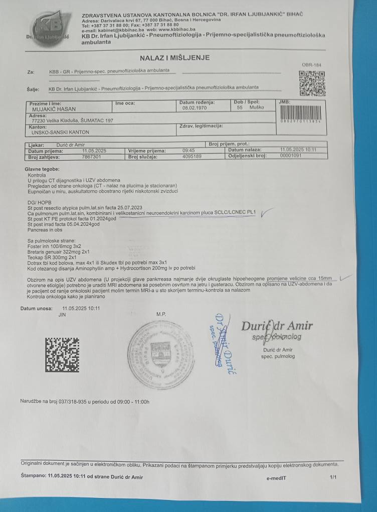 Hasan Mujakić iz Velike Kladuše već dvije godine vodi tešku životnu bitku s dijagnozom zloćudnog neuroendokrinog karcinoma pluća (SCLC/LNEC). Tokom tog perioda prošao je kroz operaciju, brojne terapije, infuzije i injekcije, a trenutno se nalazi na kućnom liječenju, gdje svakodnevno koristi kisik zbog otežanog disanja i trajnog oštećenja pluća – funkcionalnost mu je smanjena na svega 35%.