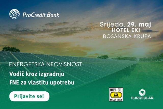Naredni „Vodič kroz izgradnju FNE za vlastitu upotrebu“, poseban događaj namijenjen podjednako privrednicima i fizičkim licima u organizaciji Hifa-Oil i ProCredit Bank, bit će održan 29. maja u Bosanskoj Krupi. Događaj je mjesto na kojem će posjetioci dobiti odgovore na sva pitanja o izgradnji i finansiranju fotonaponskih elektrana (FNE), ali i o njihovoj isplativosti, i to iz prve ruke i pozitivne prakse. Svi zainteresovani za izgradnju FNE mogu se besplatno prijaviti na ovom linku i saznati više o temi od predstavnika ove dvije uspješne kompanije, kao i od stručnjaka koji će učestvovati u panel diskusiji. Ovo je nastavak serije evenata već održanih i odlično posjećenih u Tešnju, Bijeljini, Visokom i Živinicama.