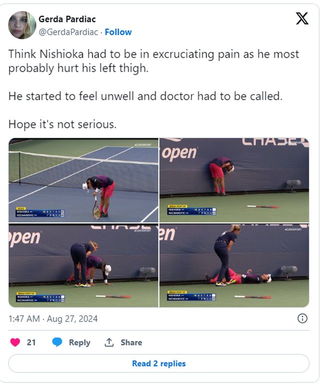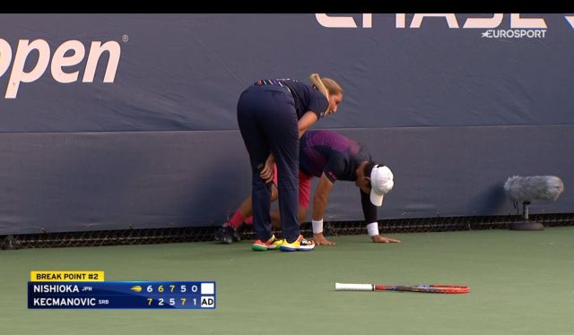 Ležao je na podu, a pomoć mu je došao pružiti i Kecmanović koji mu je donio bocu vode te sve vrijeme bio uz njega dok su ga liječnici tretirali. Na kraju je Nishioka s terena iznesen na nosilima, dok je Kecmanović prošao u drugo kolo posljednjeg Grand Slam turnira sezone.