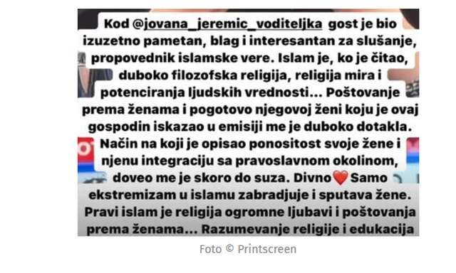 “Kod Jovane Jeremić gost je bio izuzetno pametan, blag i interesantan za sluđanje, propovednik islamske vjere. Islam je, ko je čitao, duboko filozofska religija, religija mira i potenciranja ljudskih vrijednosti. Poštovanje prema ženama i pogotovo njegovoj ženi koju je ovaj gospodin iskazao u emisiji me je duboko dotakla“, napisala je i dodala: