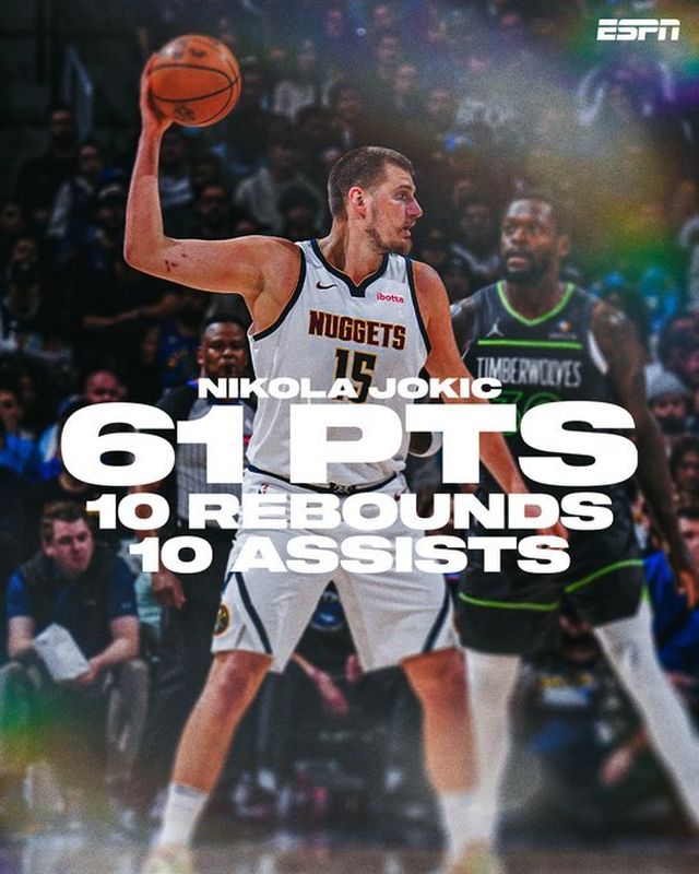 Nikola Jokić je postigao triple-double, ali se među statistikom izdvaja nestvaran 61 poen. Dodao je 10 skokova i 10 asistencija, ali ni to nije bilo dovoljno da njegov Denver ostvari pobjedu protiv Minnesote.