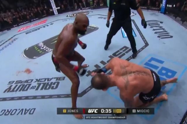 Jones je dominirao od početka borbe, Miočić je dobijao velike batine tokom prve dvije runde, a 35 sekundi prije kraja treće Jones je sjajnim kružnim udarcem nogom u rebra poslao Miočića za pod, a nakon nekoliko udaraca koji su uslijedili sudija Herb Dean je prekinuo borbu.