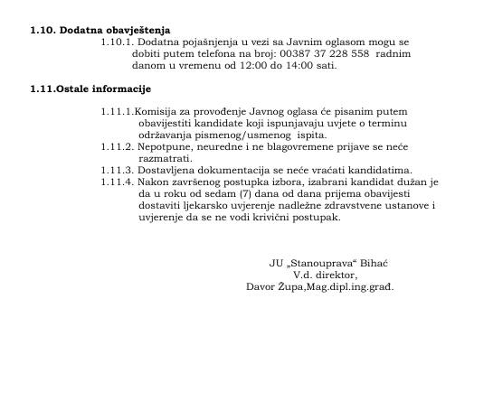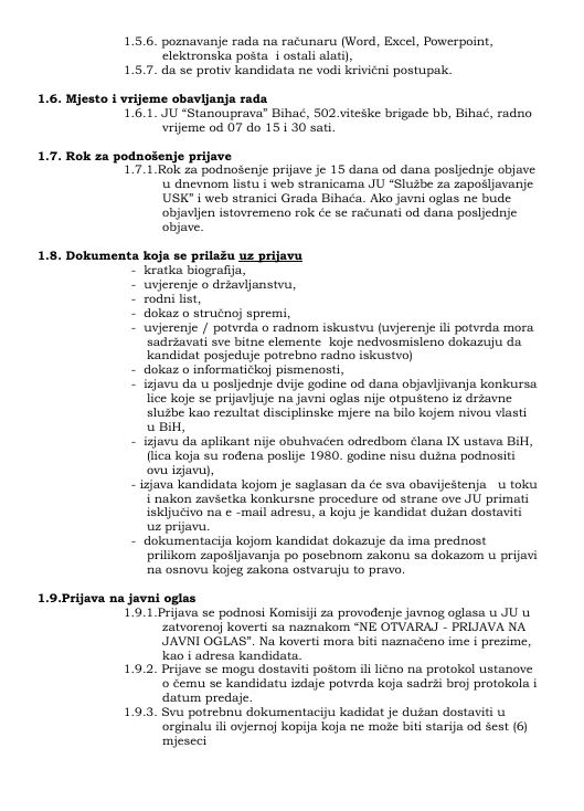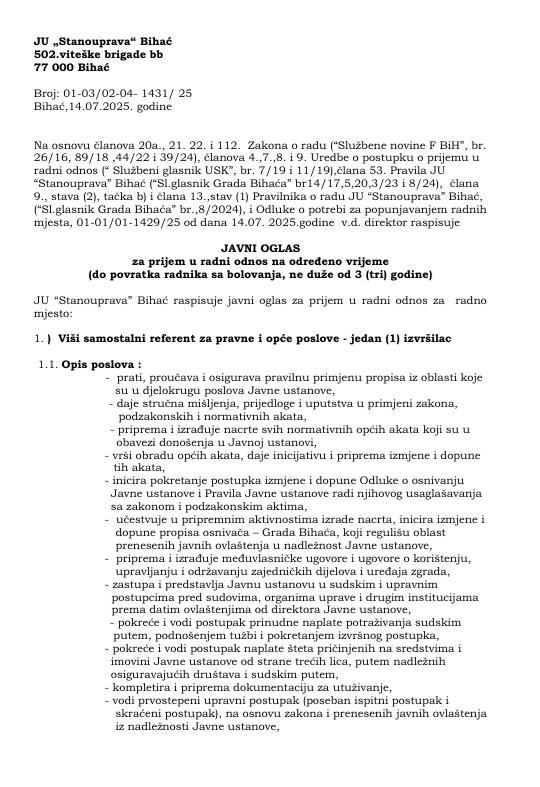 JU “Stanouprava” Bihać raspisala je javni oglas za prijem u radni odnos na određeno vrijeme za radno mjesto:
