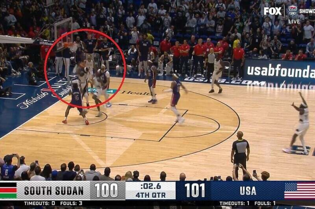 Posljednje poene na utakmici postigao je LeBron James za vodstvo i pobjedu SAD-a. No, Južnosudancima je ostalo osam sekundi za napad i šut, a imali su priliku iz dva pokušaja. Prvi šut za pobjedu promašio je Carlik Jones, a onda je njegov saigrač Nuni Omot uhvatio ofanzivni skok i imao dva šuta, te je oba promašio. Mnogi su putem društvenih mreža protestovali smatrajući da je Omot fauliran te da su sudije oduzele pobjedu Južnom Sudanu, ali je na kraju završeno rezultatom 101:100 za SAD.