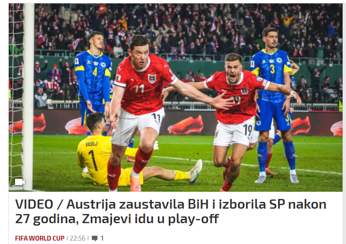 “Bosna i Hercegovina nije uspjela! Austrija iščupala bod u Beču i otišla na Svjetsko prvenstvo”, navodi Gol.hr, dok su i ostali hrvatski mediji bez mnogo emocija ispratili ovaj duel.