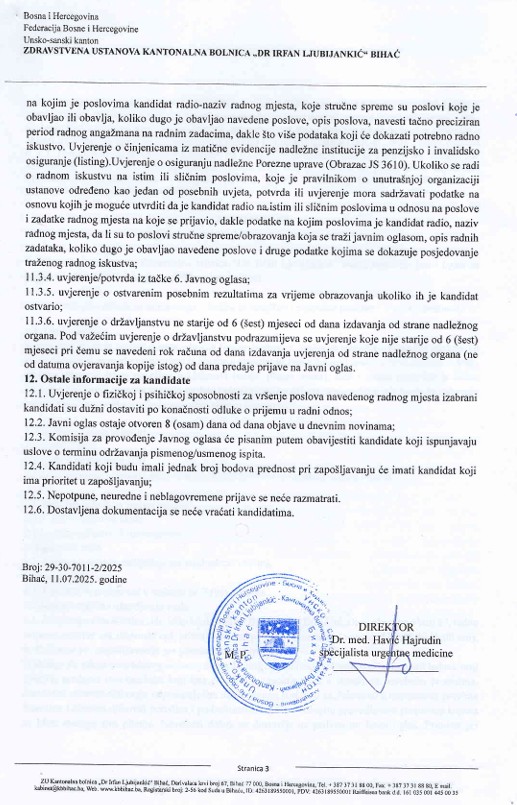 Zdravstvena ustanova Kantonalna bolnica “Dr. Irfan Ljubijankić” Bihać raspisala je javni oglas za prijem u radni odnos na neodređeno vrijeme za sljedeće pozicije: