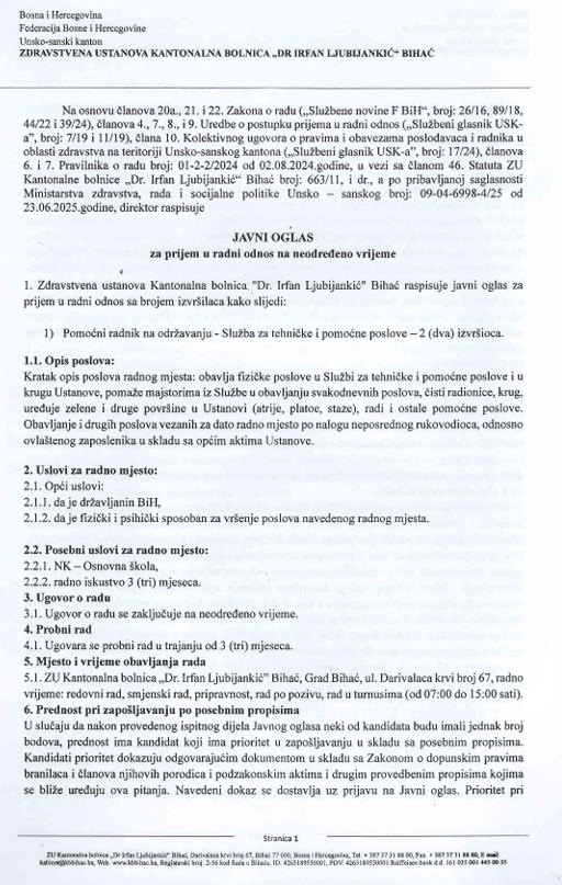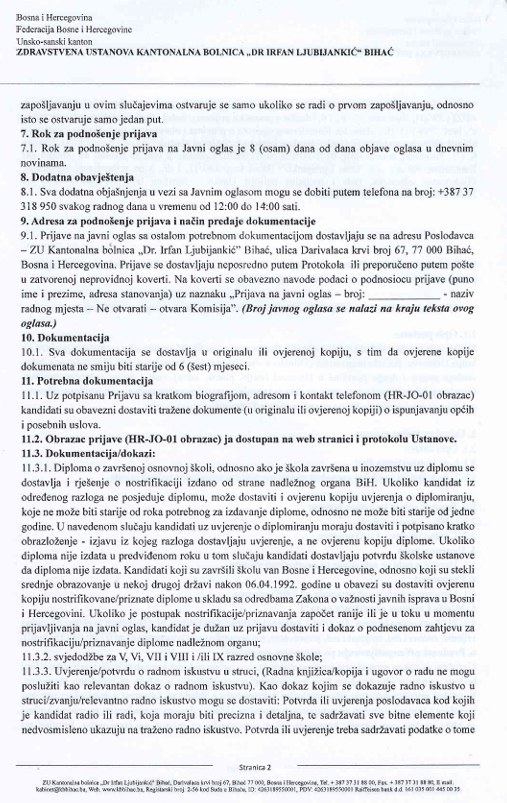 Zdravstvena ustanova Kantonalna bolnica “Dr. Irfan Ljubijankić” Bihać raspisala je javni oglas za prijem u radni odnos na neodređeno vrijeme za sljedeće pozicije: