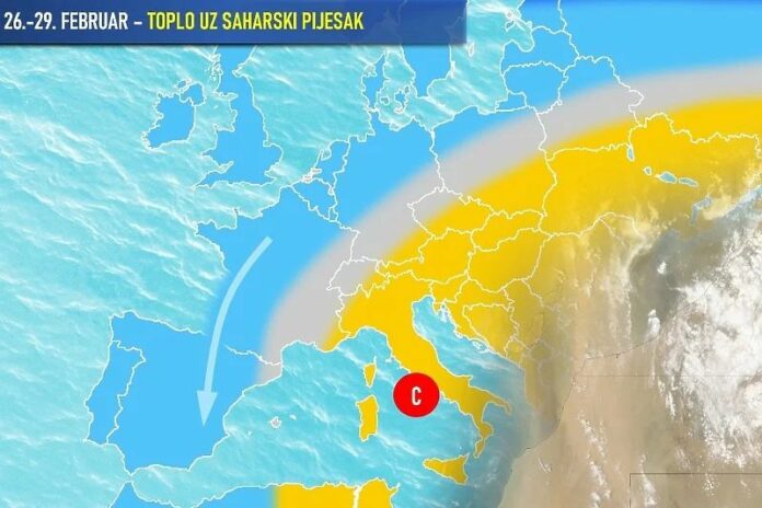U srijedu je u Bosnu i Hercegovinu vjetar donio saharski pijesak koji će utjecati na zagađenje zraka. Što se tiče vremenskih prilika, one će biti slične kao i prethodnih dana, uz smjenu sunčanih i kišnih intervala uz temperature nalik proljeću.