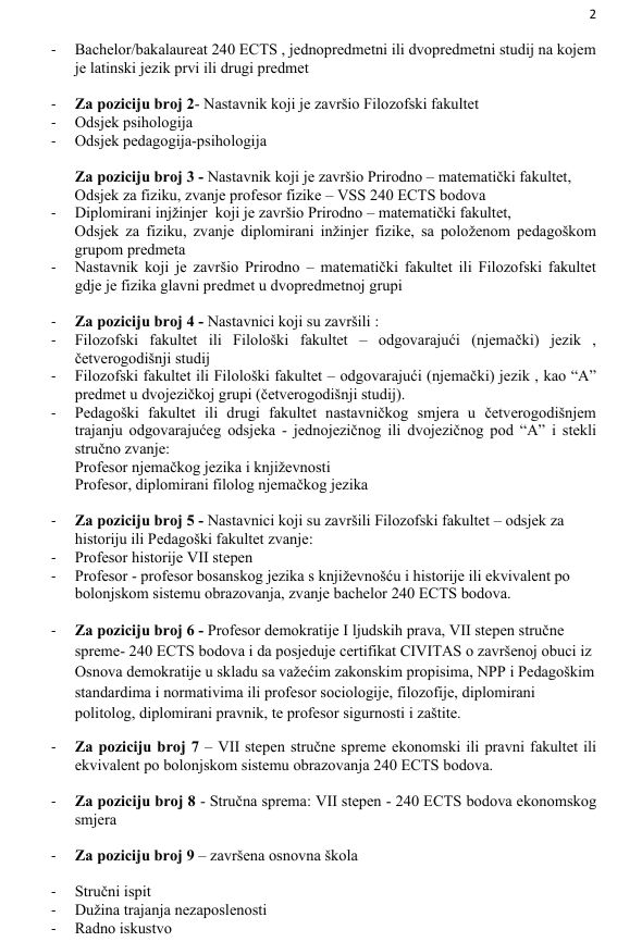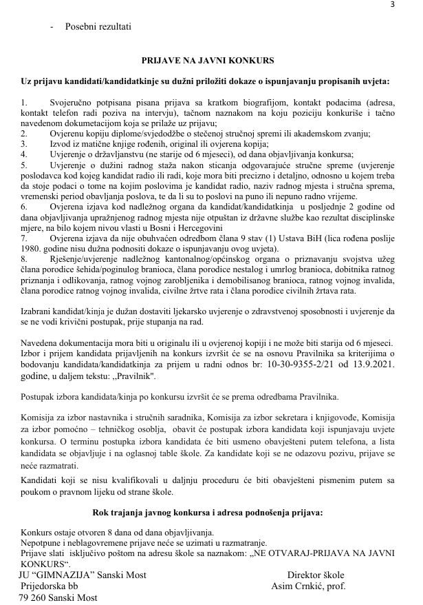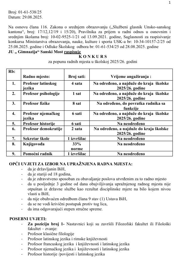 JU „Gimnazija“ Sanski Most raspisuje konkurs za prijem profesora i radnika na određeno i neodređeno vrijeme u školskoj 2025/26. godini.