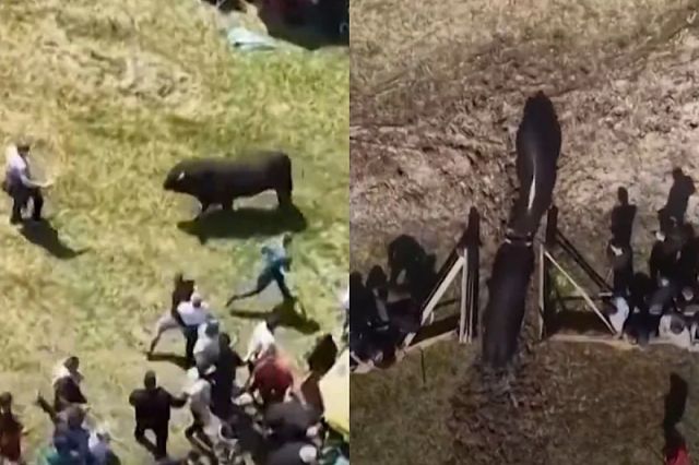 Kako se može vidjeti na snimku koji je objavila Al Jazeera, bikovi su u borbi izašli iz arene jer su vrata ostala otvorena i brzo su se našli među publikom.