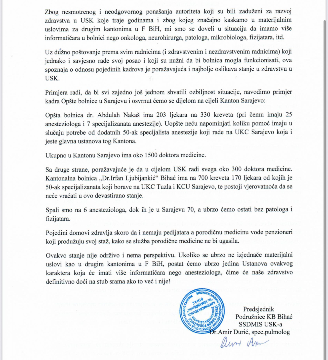 Posebno naglašavaju da u cijelom USK radi svega oko 300 ljekara, dok samo Kanton Sarajevo ima oko 1500. U Kantonalnoj bolnici Bihać na 700 kreveta radi tek 170 ljekara, od čega je pedesetak na specijalizaciji u Sarajevu i Tuzli, a pitanje je hoće li se vratiti. Upozoravaju da smo već spali na samo šest anesteziologa, te da prijeti potpuni kolaps sistema zbog manjka ključnih specijalista.