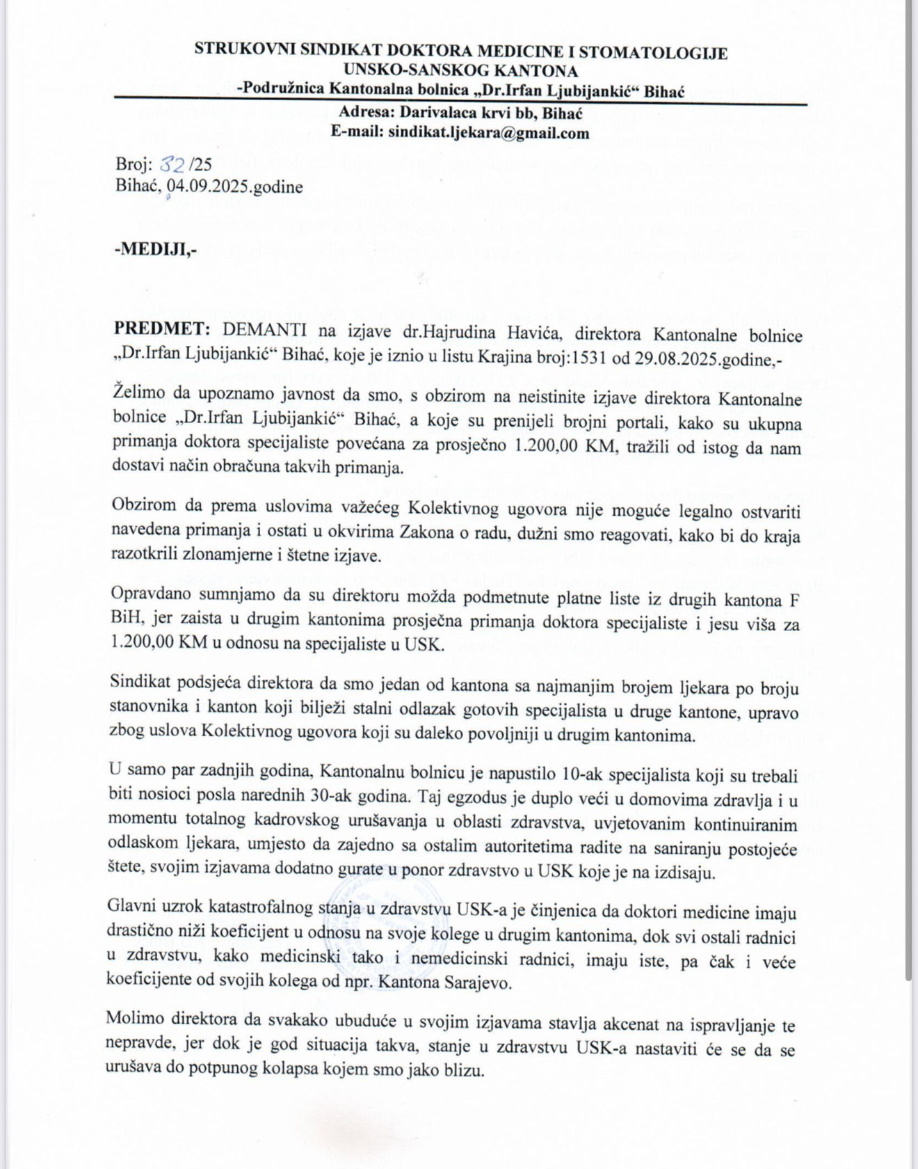 Strukovni sindikat doktora medicine i stomatologije USK demantovao je izjave direktora Kantonalne bolnice „Dr. Irfan Ljubijankić“ dr. Hajrudina Havića da su ukupna primanja specijalista povećana za prosječnih 1.200 KM. Sindikat ističe da takvo povećanje nije moguće ostvariti prema Kolektivnom ugovoru te da su ove tvrdnje netačne i obmanjuju javnost.