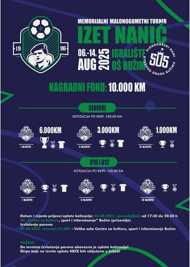 Datum i mjesto prijave/uplate kotizacije: 04.08.2025. (ponedjeljak) od 17:30 do 20:30 h – JU „Centar za kulturu, sport i informisanje“ Bužim (prizemlje)