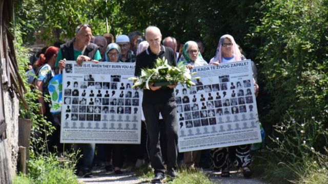 S buketom cvijeća u rukama Esad Tufekčić danas je predvodio tužnu kolonu članova porodica ubijenih žrtava koji su na Bikavcu obilježili 32. godišnjicu stravičnog zločina iz juna 1992.