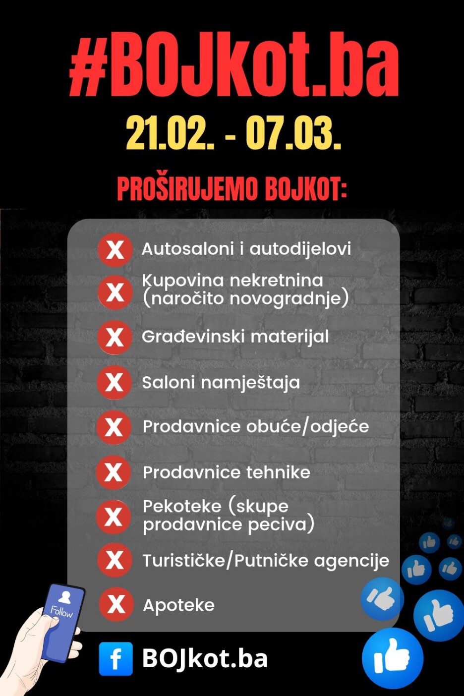 Organizatori bojkota trgovina u Bosni i Hercegovini su najavili novi bojkot od 21. februara do 7. marta, s tim da je proširen spisak trgovina koje su planirane za bojkot.
