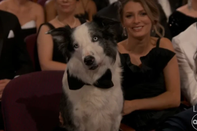 Sedmogodišnji Border Collie koji se pojavljuje u filmu “Anatomy of a Fall” sa elegantnom leptir-mašnom stigao je u Dolby Teatar gdje je zauzeo počasno mjesto u prednjem dijelu, pored najvećih zvijezda večeri.