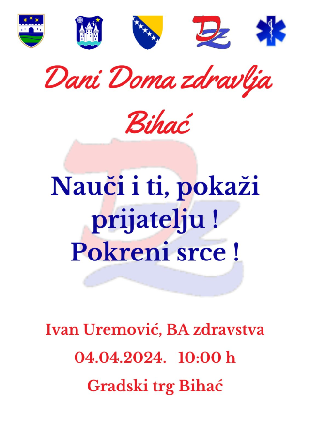 Zdravstvena ustanova Dom Zdravlja Bihać organizira pokaznu vježbu pod nazivom “Nauči i ti, pokaži prijatelju! Pokreni srce!” koja će se održati 04.04.2024. (četvrtak) u vremenskom periodu od 10:00 do 12:00 sati na Gradskom trgu.