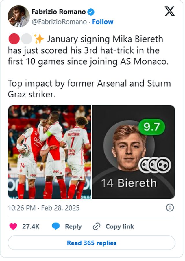 Igrao je Monaco svoj meč 24. kola Ligue 1 protiv Reimsa na domaćem terenu, a Biereth mu je hat-trickom donio pobjedu od 3:0.