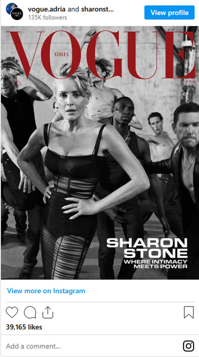 Njena modna kombinacija istakla je dekolte, a na crno-bijeloj fotografiji sa snimanja glumica se mogla vidjeti uz nekoliko muškaraca koji su upotpunili finalnu naslovnicu magazina.
