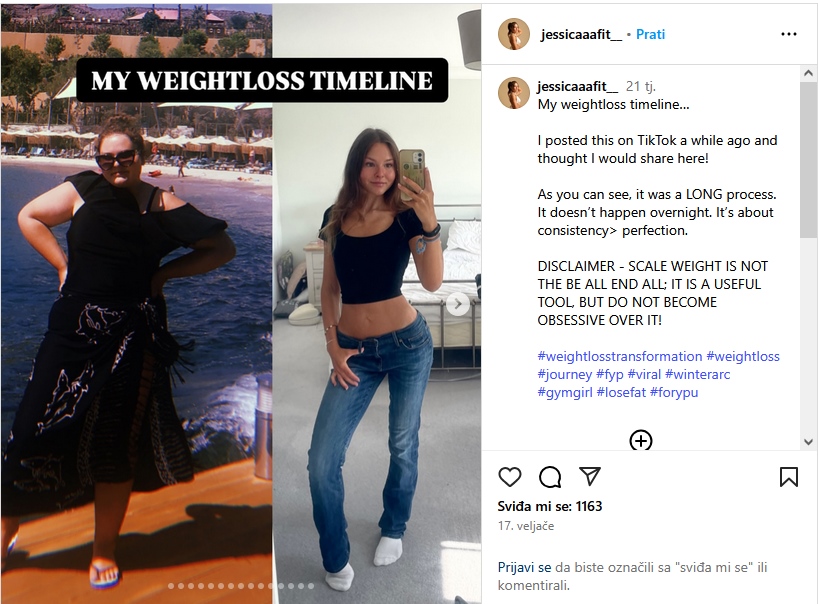 “Ne treba se bojati hrane – možete postići svoje ciljeve bez da izgladnjujete sebe. Fokusiram se na uravnotežene obroke koji mi daju energiju. Želim podijeliti svoju priču ne samo da proslavim koliko sam daleko stigla, već i da inspirišem druge – da pokažem da bez obzira odakle počinjete, moguće je uspjeti, rasti i ostvariti ono što vam je prije izgledalo kao nemoguće. Ako sam ja mogla, možeš i ti”, poručila je Jessica.
