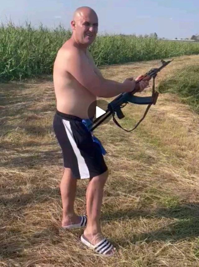 Na fotografiji odjeven samo u crne kratke hlače i plastične šlape, s automatskom jurišnom puškom tipa kalašnjikov u ruci. Stoji na čistini, tik uz polje kukuruza. U gornjem desnom uglu screenshota, svakako u dosegu puškometa, vidi se nešto nalik krovu poljoprivrednog objekta.