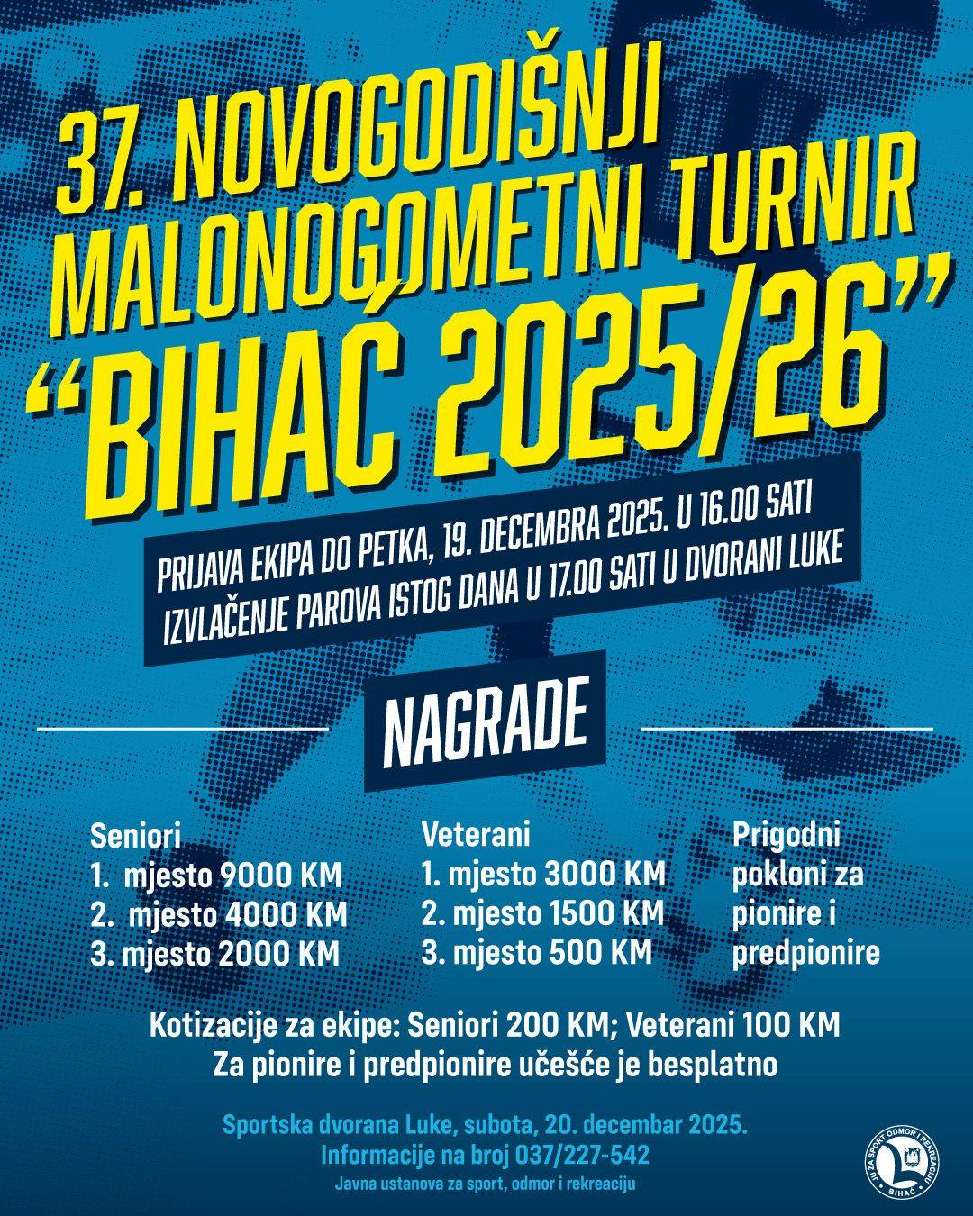 Tako će se u Sportskoj dvorani Luke održati 37. Novogodišnji malonogometni turnir “Bihać 2025/26”, uz učešće seniora, veterana, pionira i predpionira, te nagradni fond od 20.000 KM.