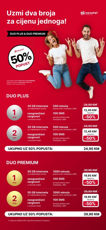 Dva broja po cijeni jednoga. Svi korisnici koji u periodu trajanja promotivne akcije potpišu zahtjev za korištenje promotivnog Duo Plus i Duo Premium tarifnog modela s trajanjem ugovornog odnosa od 24 mjeseca, dobivaju duple benefite: