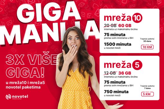 Ali to nije sve! Uz našu novu akciju Gigamanija, vaše iskustvo korištenja interneta dostići će potpuno novi nivo. Sada dobijate nevjerovatnih 3X VIŠE GIGA u našim novotel paketima na dopunu mreža10 i mreža5! To znači da možete istraživati, dijeliti sadržaj i ostati povezani više nego ikada prije, bez brige o ograničenjima podatkovnog prometa.