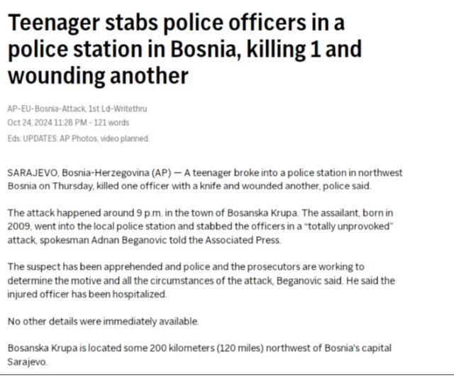 Kako smo ranije objavili, maloljetnik je nožem napao dva policijska službenika policijske stanice Bosanska Krupa, te jednog usmrtio, a drugog povrijedio.