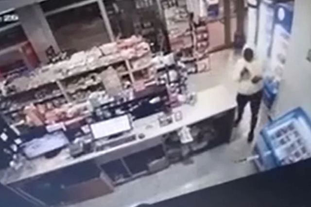 Na snimku se vidi kako u radnju ulazi naoružana osoba sa kapom i kapuljačom na glavi. Približava se kasi i uzima novac dok radnik koji se nalazi u blizini stoji s podignutim rukama.