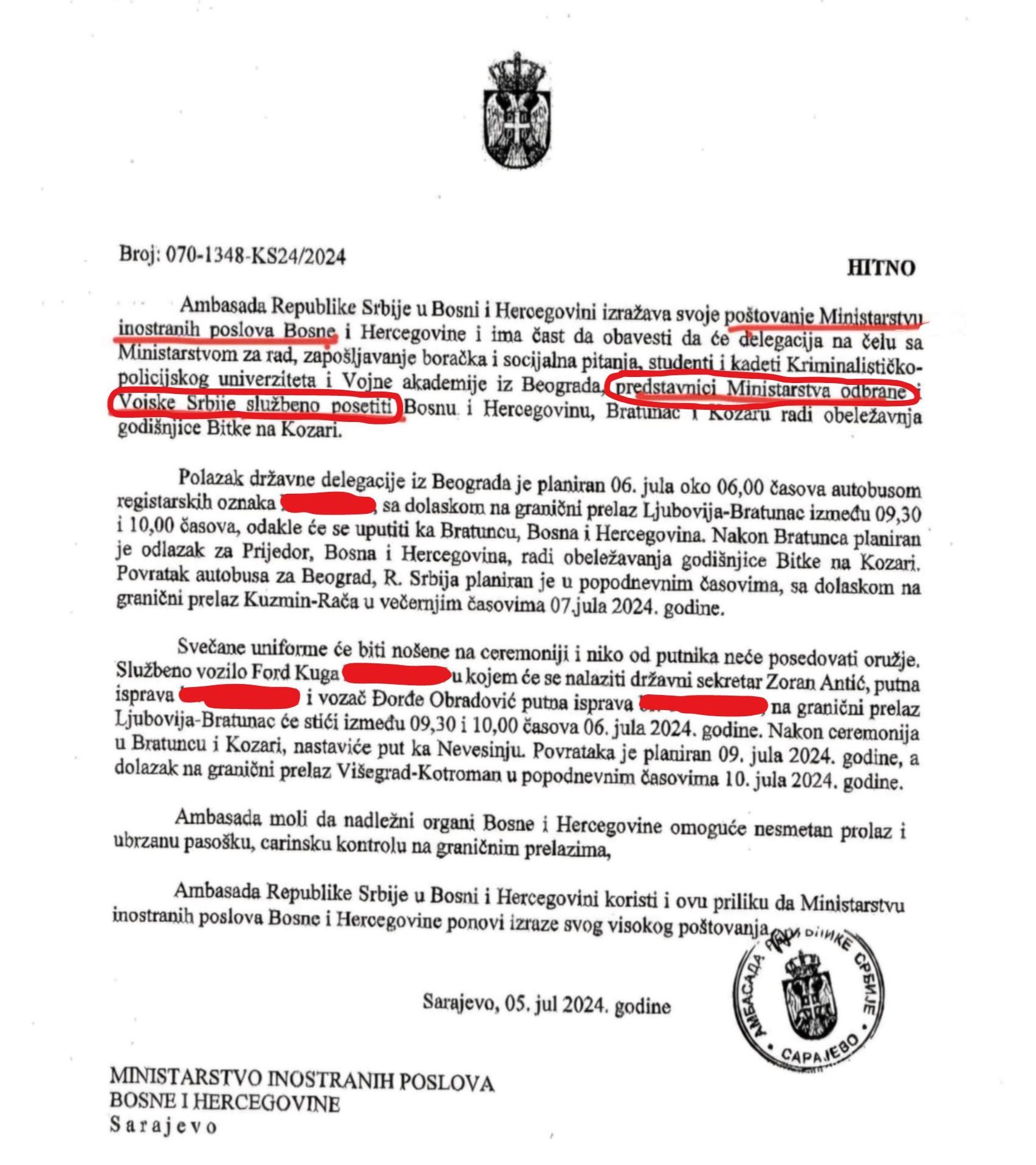 Kako se vidi, dopis je Ambasada Srbije u BiH poslala Ministarstvu vanjskih poslova naše zemlje u petak, 5. jula.