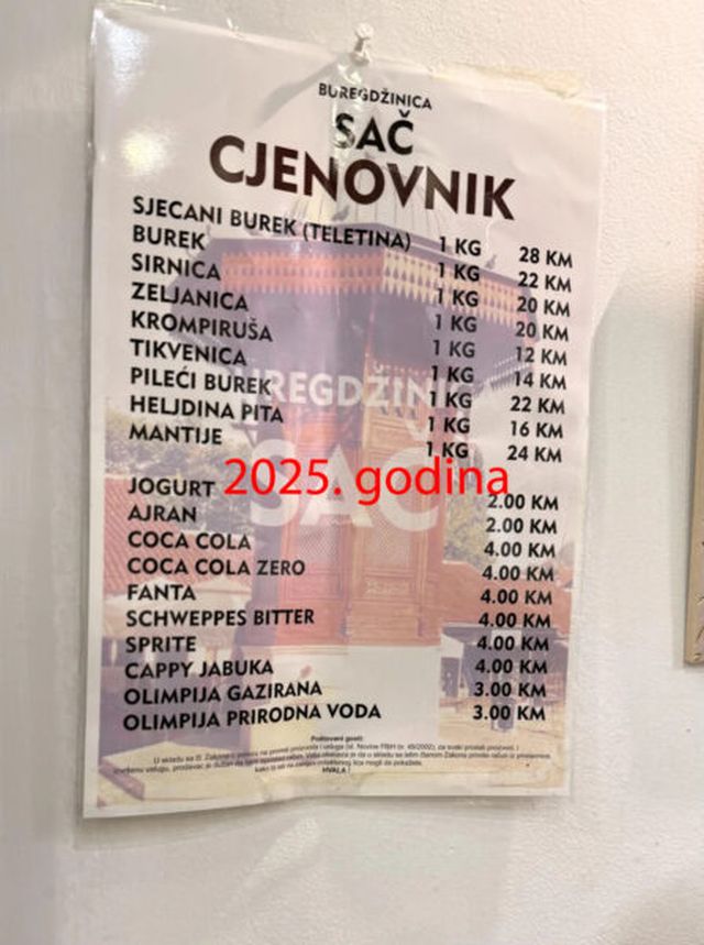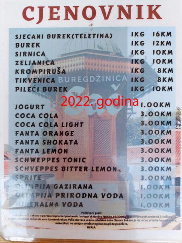 Zanimljivo, čitatelji su postavili i meni iste buregdžinice koji je iz 2022. godine. Na njemu se najbolje vidi drastičan skok cijena. 2022. godine je kilogram sjecanog bureka bila 16 KM, bureka 12 KM, sirnice i zeljanice 10 KM, krompiruše 8 KM…