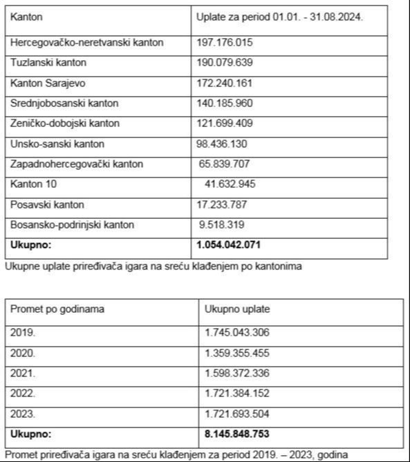 Zaključno s avgustom ove godine, ukupan promet priređivača igara na sreću klađenjem iznosio je 1.054.042.071 KM. Najviše novca – 197,1 milion KM – izdvojili su građani HNK, dok su uplate u BPK Goražde iznosile 9,5 miliona maraka.