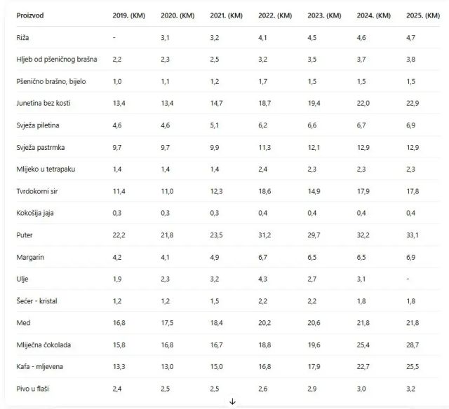 Stvari se drastično mijenjaju 2022. godine, pa tako cijena kilograma putera s 23 KM skače na više od 30 KM, drastično poskupljuje i sir i mlijeko, te svi mliječni proizvodi, da bi u 2023. godini zabilježen pad cijene sira, ulja i putera. Međutim, cijene mesa ne padaju, nego samo rastu. U odnosu na 2019. godinu, 2024. godine cijena riže je skoro dupla, hljeba također, a cijena kafe bilježi znatan skok.