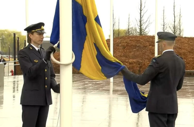 Pod stalnom kišom, švedski premijer Ulf Kristersson i generalni sekretar NATO-a Jens Stoltenberg gledali su kako dva vojnika podižu plavu zastavu ukrašenu žutim krstom među zvaničnim krugovima nacionalnih zastava u sjedištu u Briselu, Belgija.